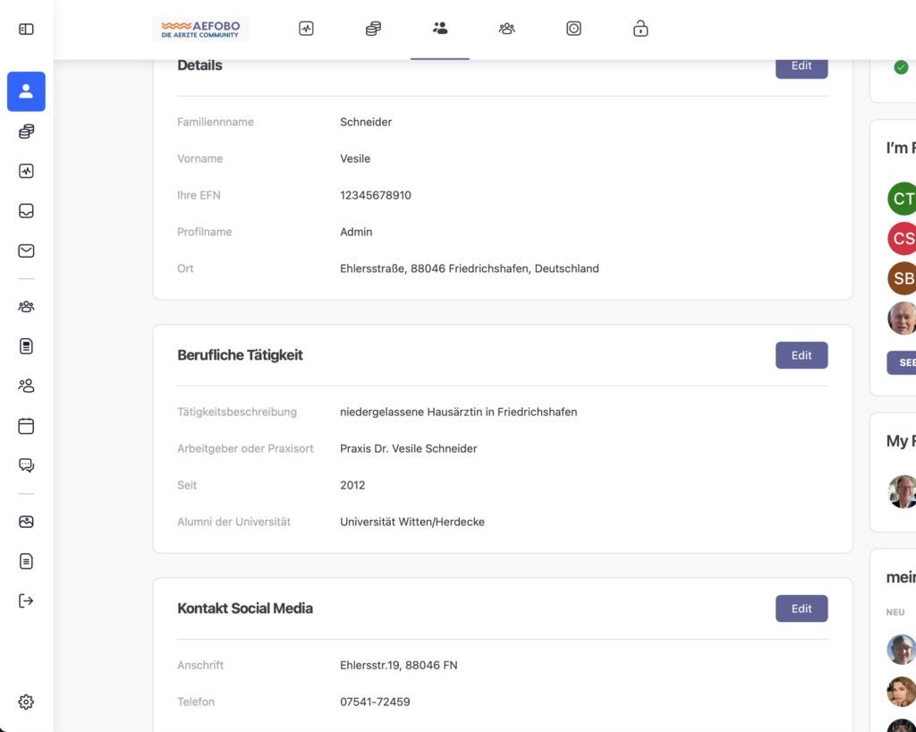 Die Profile in AEFOBO sind dabei wesentlich umfangreicher und vielseitiger als die von Facebook oder Instagram. So gibt es zum Beispiel zahlreiche Felder, die je nach den Bedürfnissen der Gemeinschaft über „benutzerdefinierte Felder“ hinzugefügt und angepasst werden können.