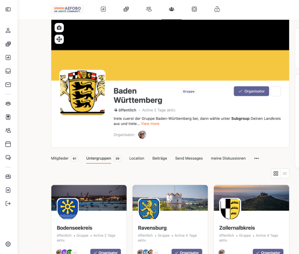 Wir fangen mit Baden-Württemberg an. Es gibt die übergeordnete Gruppe BW und in dieser Gruppe befinden sich die Untergruppen, alle Landkreise in BW. Das entspricht sowohl den KV-Kreisen wie auch den Kreisen der Ärztekammer. Jedes Mitglied kann seinem Bundesland und seinem Landkreis beitreten und findet dann die Kollegen aus seiner Nähe.