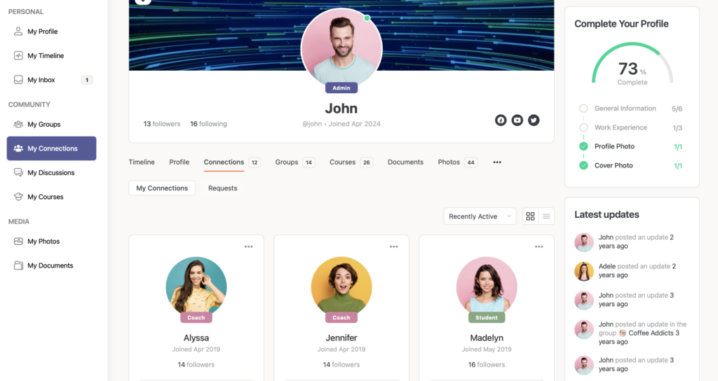 Der Aktivitäts-Feed ist der Ausgangspunkt für jede soziale Interaktion auf auf der Seite. Er zeigt alle Aktionen der Nutzer in chronologischer Reihenfolge an. Das kann zum Beispiel ein neuer Blogbeitrag sein, den ein Mitglied veröffentlicht hat, ein neues Foto, das hochgeladen wurde oder ein neuer Beitrag oder neues Thema im Forum. Es ist möglich, direkt in den Aktivitäts-Feed zu posten. Hierbei können neben Text, Bildern, Videos auch Dokumente übertragen werden und Smileys und GIPHYs eingefügt werden. Durch die (deaktivierbare) Option „Live-Update“ werden neue Aktivitäten dynamisch angezeigt, ohne, dass die Seite im Browser neu geladen werden muss.
