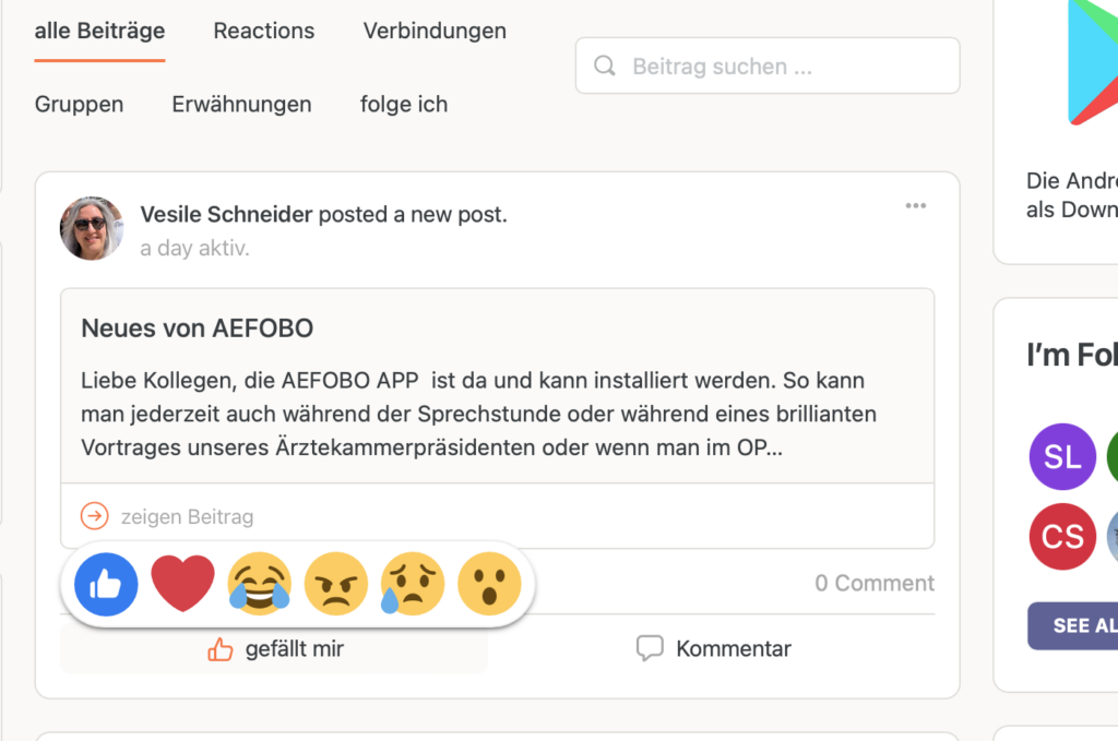 Kürzere Beiträge kann man auf der Aktivitätsseite posten, aber manchmal möchte man etwas längere Beiträge schreiben zu bestimmten Themen. Auch hierfür gibt es die Möglichkeit bei AEFOBO. Jedes Mitglied kann sich am Artikel-Blog beteiligen und Beiträge veröffentlichen.